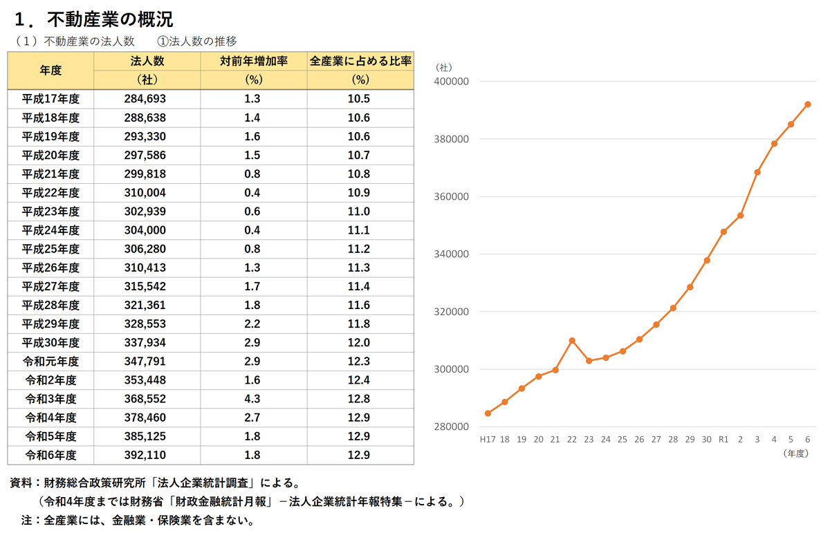 公益財団法人不動産流通推進センターが出している資料によると、不動産業の法人数は過去20年伸び続けており、2005年284,693社だった法人数は2025年に392,110社に増えています。