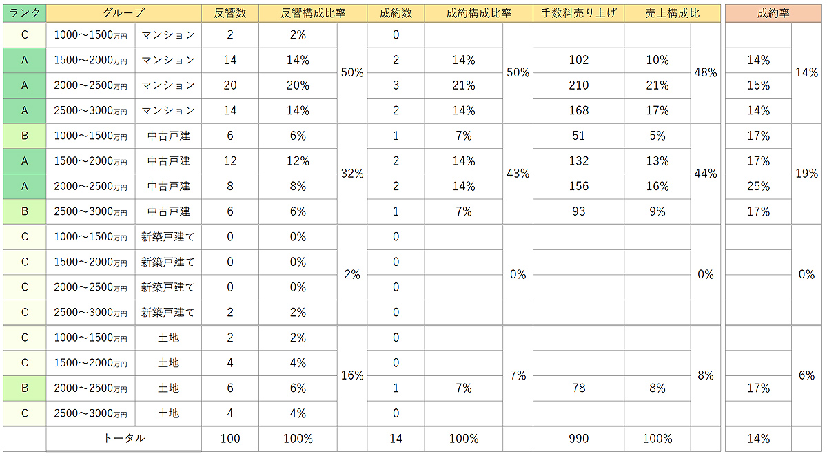 例として不動産売買仲介における種別ごとの反響数・成約数・売上の表組を作成し、売上構成比を基準にランクわけしたABC分析のサンプルが下記となります。